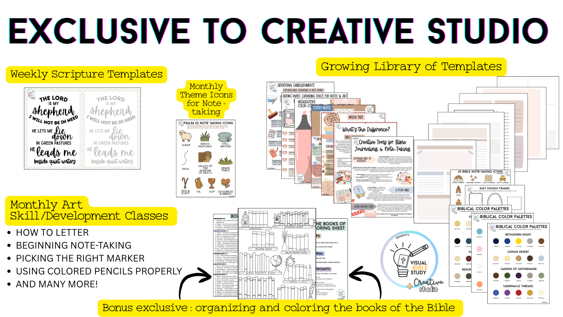 The Creative Studio is designed for visual thinkers and creative learners who want to engage Scripture in a hands-on way. It connects what you learn to how you process and remember it.